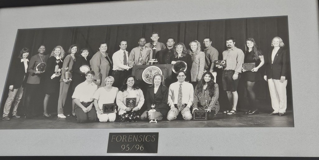 Last Saturday we had our “Rookie” Tournament for our Intro to Public Speaking, Small Group Communication, and Argumentation and Debate classes. It is a long-standing tradition. I took part in my very first Rookie Tournament as a judge 30 years ago! I was on the Speech and Debate team as a competitor and I remember thinking how cool it was that I got to judge these debate class students. I took this photo of our framed team photo from that year that hangs on the wall of our team room to this day: