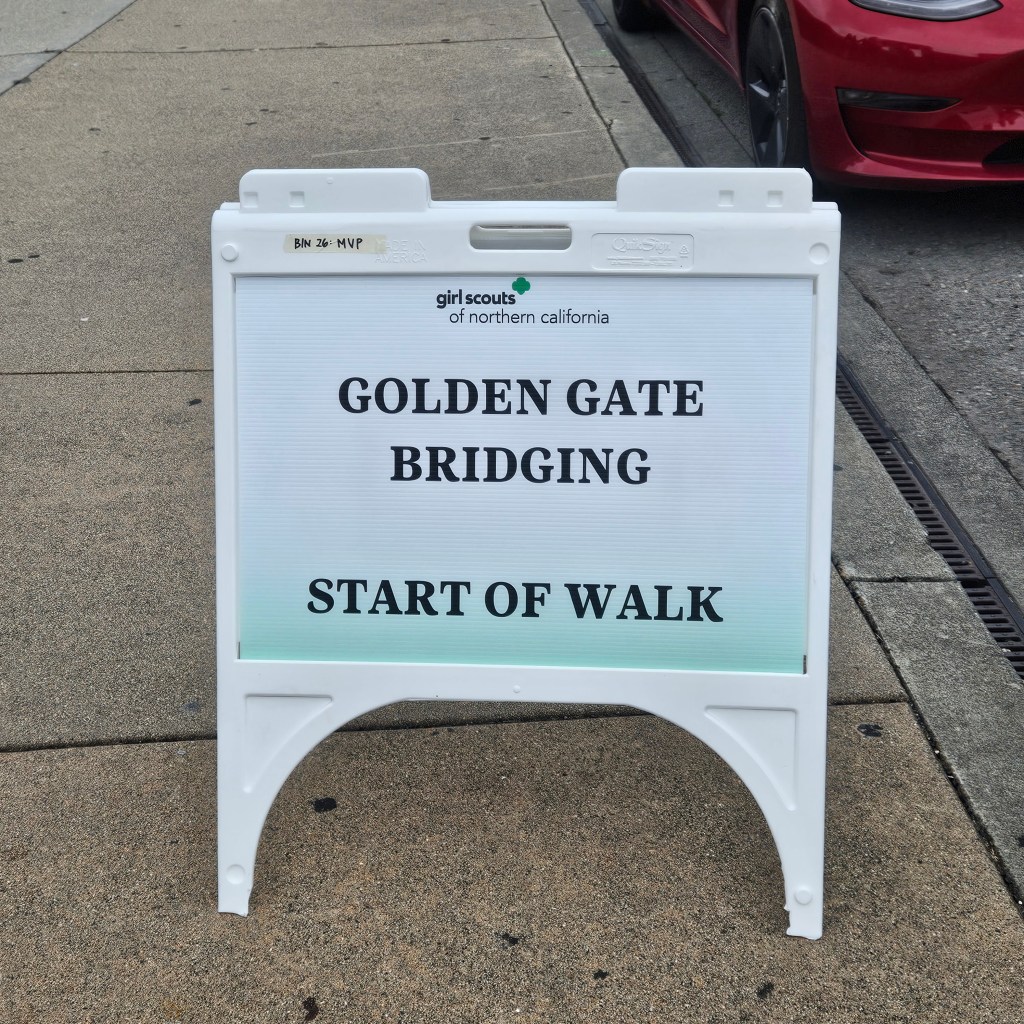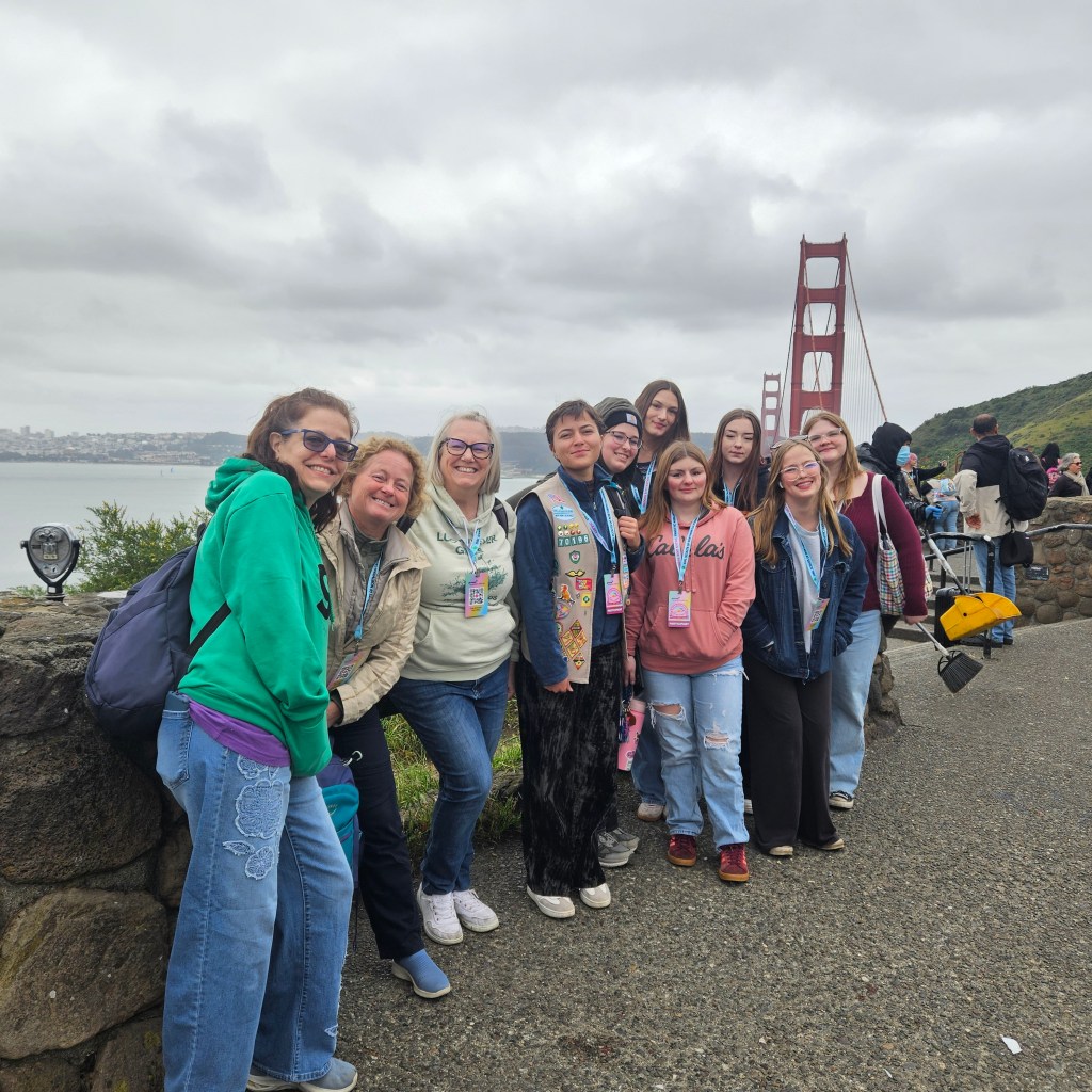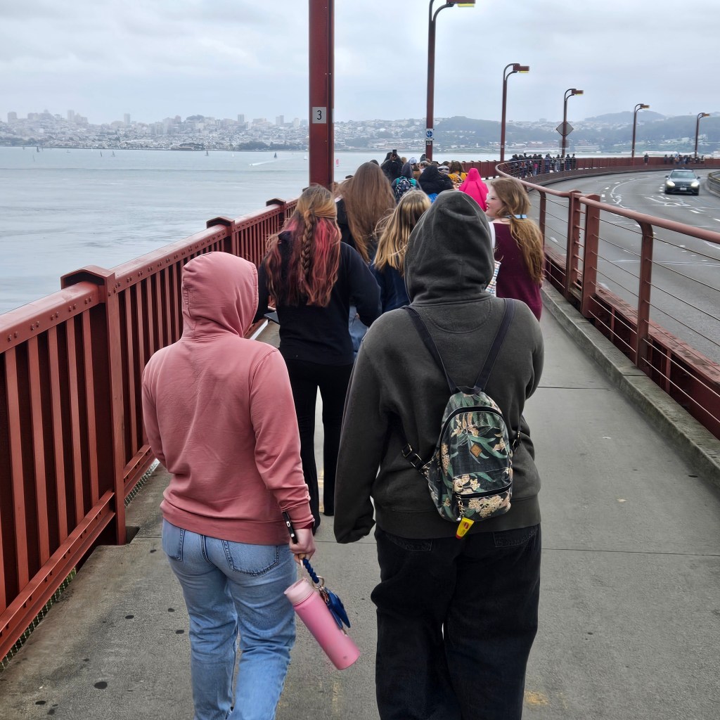 We walked across the Golden Gate Bridge to celebrate our senior bridging to adult Girl Scouts, along with others who missed their ceremony during COVID. It was the first big bridging event since then, and even though we did a small, socially distanced version at a local park back in the day, I couldn’t pass up this experience.